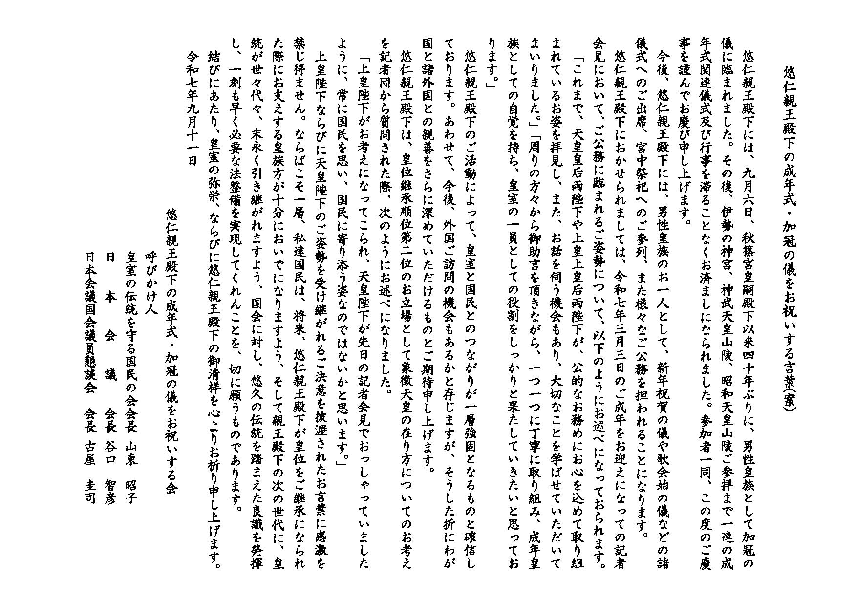 上皇陛下ならびに天皇陛下のご姿勢を受け継がれるご決意を披瀝されたお言葉に感激を禁じ得ません。ならばこそ一層、私達国民は、将来、悠仁親王殿下が皇位をご継承になられた際にお支えする皇族方が十分においでになりますよう、そして親王殿下の次の世代に、皇統が世々代々、末永く引き継がれますよう、国会に対し、悠久の伝統を踏まえた良識を発揮し、一刻も早く必要な法整備を実現してくれんことを、切に願うものであります。